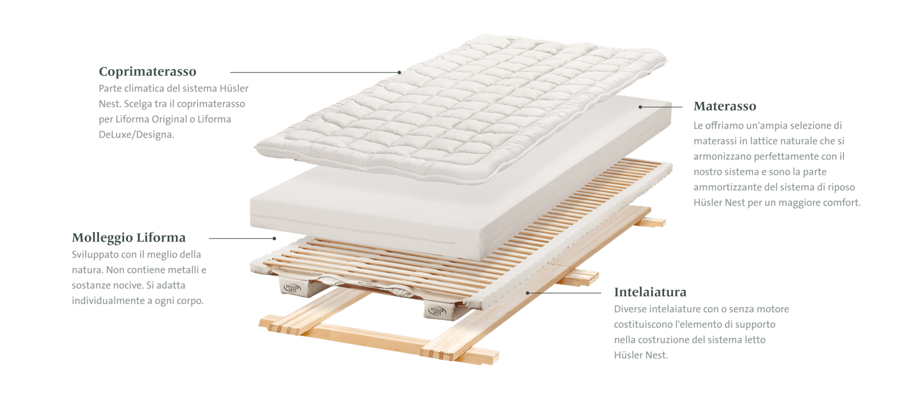 Il sistema per il sonno Hüsler Nest vi accompagnerà per tutta la vita. Poiché ogni componente ha una propria durata, il sistema per il sonno è stato concepito in modo che ogni elemento possa essere sostituito singolarmente.